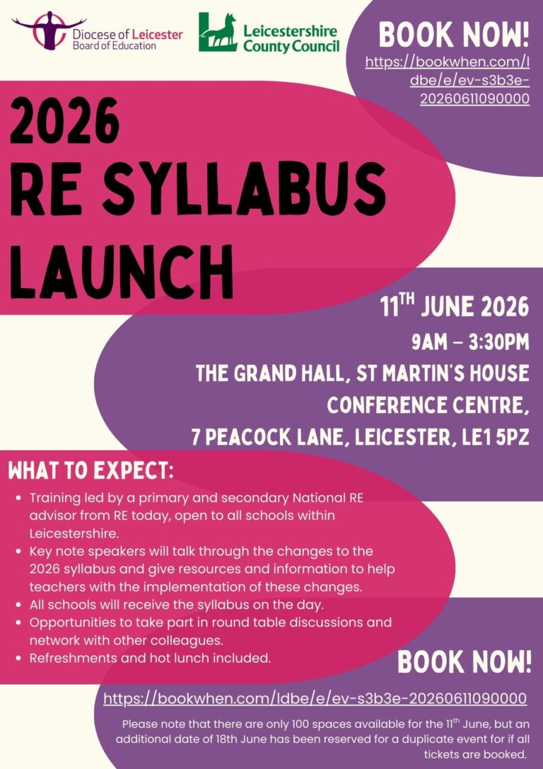The 2026 RE syllabus launch will be led by a primary and secondary National RE advisor from RE today and so it is open to all schools within Leicestershire. Key note speakers will talk through the changes to the 2026 syllabus and give resources and information to help teachers with the implementation of these changes. All schools will receive the syllabus on the day of the launch and there will be opportunities to take part in round table discussions and network with other colleagues. Included in the day is all refreshments and lunch.